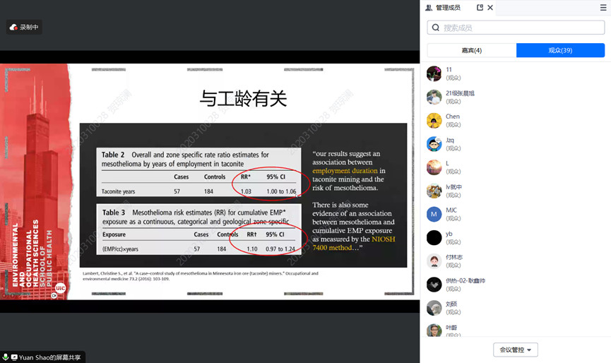最后介绍了对恶性胸膜间皮瘤的流行病研究。2008~2013年,明尼苏达大学展开了铁隧矿工人健康研究,对7个矿场的28个工种进行数据收集,并实地采集纤维样本进行分析。团队基于这些数据展开筛选和流行病学对照分析,发现了工龄和历史累计暴露量两个风险因素。此外,还就纤维长度对恶性胸膜间皮瘤的影响展开了进一步的研究。