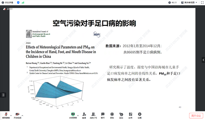 最后进行了总结与展望。研究发现宁波市的研究结果与全国相关研究结果类似。团队基于大数据信息平台以及CNMAPS队列,梳理了宁波市空气污染对生命健康相关事件的影响,提出了空气污染对主要健康事件的影响评估结果。该结果为开展环境健康危害干预工作提供依据,便于评估健康影响、制定缓解策略。在展望环节,贺天锋老师认为下一步需要关注不同健康结局的影响,建立更精准的环境污染物暴露评估方法,考虑个体敏感性、脆弱性以及社会经济因素,基于复合空气污染暴露对健康影响展开因果分析,发展基于实验室的检测方法以确定患者实际暴露的空气污染水平及相应生物标记物。