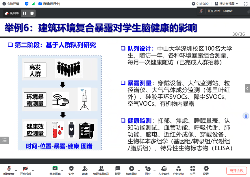 其后以对研究进展进行了展开介绍。向建帮老师及其课题组研发了穿戴式环境与生理监测设备(WPEM),为环境健康中个体暴露精细化评估提供了便利工具;精细化评估了国室内PM2.5和O3暴露造成疾病死亡负担,揭示了不同限值场景下可避免的疾病死亡人数;探索了集中系统空气净化对人健康影响效应和相关机理,发现了低浓度臭氧对心血管功能的负面影响和可能机理;进一步探究了短期使用(12-19h)空气净化器对人暴露和健康指标的影响,发现短期使用真净化器可降低气道阻力和血栓风险(迟滞效应);还研究了光暴露干预对人心理与神经类疾病的疗愈效果,并综合问卷调查和人群队列研究的方法,探究建筑环境复合暴露对学生脑健康的影响。